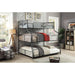 Olga III Sand Black Twin/Full/Queen Bunk Bed, 82 1/4"L X 63"W X 75 1/2"H, 182.6lbs. Take it back a few decades with this industrial inspired bunk bed. The visible piping framework is finished in antique black to create an authentic throwback atmosphere. This three tiered bunk has a unique look with its staggered bed sizes and a swo oping curved ladder. The twin on-top-of full on-top-of queen size beds can accommodate a variety ages and sizes. Features: Industrial Antique Black Metal, Others 3-Tiered Bunk Bed Pipe-inspired Framework Hand Painted Copper Details Metal Upper Guard Rails 2 Attached Ladders Full Metal Construction
