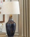 • Made of indigo and goldtone metal with fabric modified drum shade