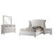 Get ready to add exquisite glamour to your space with this white upholstered bedroom set. The dramatic headboard offers incredible contemporary appeal with velvet upholstery, button tufting, crystal-like accents and hand-applied nailhead trim with a chrome finish. The matching nightstand comes equipped with a crocodile textured door panel and a glimmery chrome top drawer panel. The seven-drawer dresser with mirror and optional five-drawer chest offers the same texture and sparkly finish. Sleek chrome bar pulls perfectly complement the tapered legs on the panel bed and the bun style feet for the storage pieces.