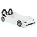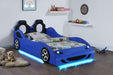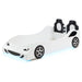 Modern race car aesthetics inform the design of a novelty car bed perfect for kids. Its twin size is versatile, allowing for plenty of space to play within the bedroom. The car is complete with realistic details and features LED strip lighting underneath, creating a fun glow that easily doubles as a nightlight for smaller kids. Curvy sides mimic the lines of a real race car while creating side rails that help keep restless sleepers from slipping out of bed in the night. Black decorative details finish the look, offering realism and whimsy.