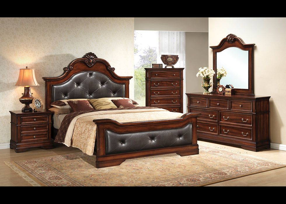 BEAUTIFUL TRADITIONAL STYLE ALL WOOD CONSTRUCTION BEDROOM IN A DARK BROWN FINISH; PADDED PU HEADBOARD AND FOOTBOARD; WOOD CENTER GUIDED DRAWERS; MATCHING TOP SHAPED HEADBOARD AND MIRROR; AVAILABLE IN KING SIZE; BED REQUIRES FOUNDATION