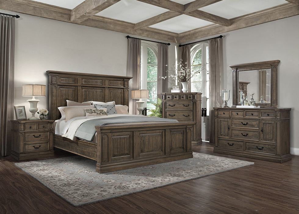 SOLID WOOD CONSTRUCTION; TRADITIONAL SYTLE IN A WESTERN BROWN FINISH WITH DARK HIGHLIGHTS; ROLLER GUIDED DRAWERS; FELT LINE TOP DRAWERS; BLACK RUSTIC HARDWARE; AVAILABLE IN KING SIZE