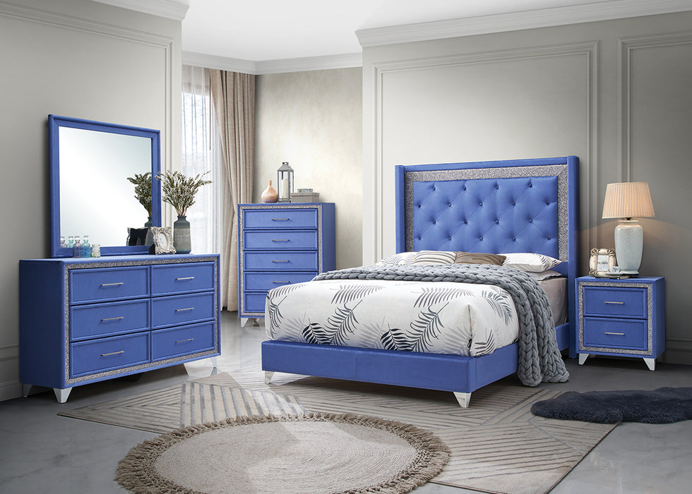 GLAMOUR STYLED BEDROOM IN A BLUE FABRIC COVERING; UNIQUE PORTRAIT FRAME ON DRAWER FRONTS; FAUX CRYSTAL HIGHLIGHTS ON ALL CASE PIECES; ALL CASES HAVE CHROME LEGS; BED AVAILABLE IN QUEEN AND KING SIZE; BED REQUIRES FOUNDATION