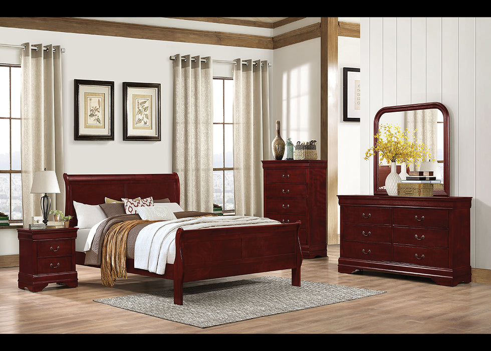 LOUIS PHILIPPE STYLE BEDROOM; ALL WOOD BEDROOM IN A CHERRY FINISH; DRAWERS FEATURE A DOVETAIL CONSTRUCTION ACCENT; BED REQUIRES A FOUNDATION; AVAILABLE IN: KING, QUEEN, FULL AND TWIN