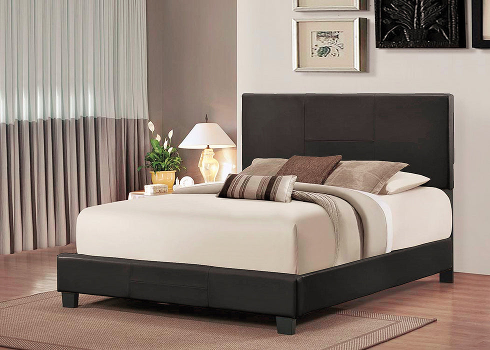 UPHOLSTERED BED IN DARK BROWN PU FABRIC; BED IS AVAILABLE IN 4 SIZES: TWIN, FULL, QUEEN AND KING; BED IS MATTRESS READY