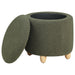 Nestled atop subtle, natural brown rounded wood feet, this round storage ottoman is a stylish statement of comfort and practicality. Upholstered in a soft faux sheepskin, it beckons with tactile appeal, inviting a moment of relaxation. The removable top uncovers a hidden compartment, perfect for stowing away books, throws, or other living essentials. Whether used as a chic accessory, a cozy footrest, or secret storage, this ottoman is a versatile addition to your home decor.