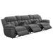 A trio of recliners and pair of consoles create a theater-inspired seating experience for your home. A modified power reclining sofa is the ultimate in indulgence, creating plush comfort and relaxation for movie marathons and Sunday game days. Charcoal fabric upholstery is smooth and soft, complementing seating designed for exceptional comfort and support. Each seat is divided with a storage console, offering a spot for snacks and essentials and offering a pair of cupholders that keep refreshments within reach. On either end of the sofa, pillowtop arms add plush, inviting style for your living area or dedicated media room.