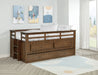 This captain's bed delivers a practical and stylish solution for children's rooms or compact spaces. Crafted from pine wood, plywood, and MDF, it features guardrails for added safety, a built-in ladder for easy access, and a bold finish that enhances its modern look. Two spacious drawers with smooth-gliding tracks keep essentials within easy reach, while the included slat kit ensures a durable, mattress-ready frame without the need for a box spring. Designed to maximize both style and functionality, this bed is perfect for versatile living.