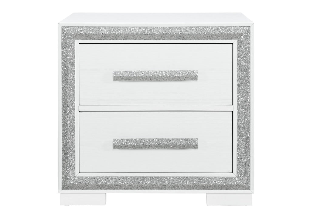 Complete your bedroom set with the Andros Nightstand by Global Furniture USA, a perfect blend of form and function. This chic nightstand features the signature white finish and silver glam accent trim of the Andros collection, creating a consistent and stylish look. The compact size does not compromise on storage, with drawers that provide easy access to your nighttime necessities. The sleek glam drawer pulls add a refined touch, making this nightstand not just a piece of furniture, but an accent that elevates the elegance of your sleeping quarters.