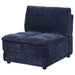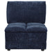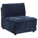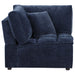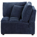 The corner chair seamlessly connects sectional components while maintaining style and comfort. Upholstered in soft blue corduroy with a pillow top grid-tufted design, it provides deep, supportive seating. The fully encased solid and engineered wood frame, combined with sinuous spring seating and pocket coil springs, ensures long-term durability.