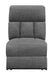 This armless power recliner seamlessly integrates into the modular sectional, offering customizable comfort and sleek versatility. Upholstered in soft charcoal fabric, it features plush padding with a channel-tufted backrest for optimal support. The power reclining mechanism allows for smooth adjustments at the touch of a button, ensuring effortless relaxation. Designed to blend seamlessly with other sectional components, it enhances both comfort and flexibility.