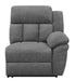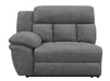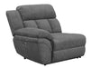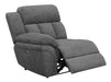 Designed for seamless modular integration, this right-arm facing power recliner enhances sectional configurations with plush seating and smooth reclining. Upholstered in soft charcoal fabric, it features deep cushioning and a channel-tufted backrest for enhanced support. The power reclining function offers effortless adjustability at the touch of a button, providing personalized comfort. A padded armrest adds to the relaxation experience.