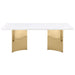 Instill a sense of luxury with this striking contemporary dining table, featuring a genuine white marble table top. The rectangular table, constructed with engineered marble veneer, china white marble, and MDF, comfortably seats friends and family, offering a fresh, modern look. Brimming with elegance, the table showcases the white marble to perfection, allowing its natural veining to create a rich, refined character. Adding a touch of glamour, the table is supported by a double pedestal base, each pedestal being a curvy, three-sided structure made of champagne gold stainless steel. This stunner is an exceptional focal point in any sophisticated dining room.