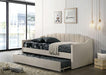 KOSMO Twin Daybed, Beige, BED: 81 7/8"L X 42 1/8"W X 39 5/8"H, TRUNDLE: 76"L X 40"W X 9 1/4"H, 116.9lbs. Staircase headboard design and sleek vertical channel tufting come together in this classy contemporary daybed. Rest your arms on the sloped track armrests as you lounge with friends in the morning. Then pull out the bottom trundle for extra sleeping space when it's time to go to bed. Fully upholstered in fabric, it's the kind of space-saving furniture that will take your space up a notch.
