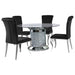 Invite over a few guests to celebrate at this modern glam dining table. A round, clear glass top reveals the scintillating column-inspired pedestal frame beneath, offering an open and airy look. Sparkling faux diamonds are encrusted within the base for a luxe touch. Defining the flush bottom base and the top is a gleaming mirror tile trim that reflects its surroundings effortlessly. Slide up each of the four velvet upholstered side chairs and enjoy a restful dining experience with their tall backrests and rolled tops.