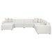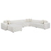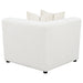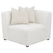 Bridge two modular sectional pieces together effortlessly with this modern corner chair, designed in an easy-to-maintain bright pearl performance upholstery across its foam padded pocket coil seat and a low-profile backrest. Bold black round legs offer a touch of contrast as they peek out from the bottom edge of this modular corner chair.