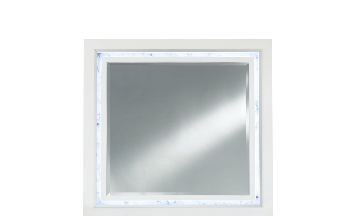 Introducing the luxurious Santorini mirror from Global Furniture USA. Presented in an exquisite white that can easily accommodate any room style or color scheme. Features include faux marble border, large scale mirror, and LED lighting all created with quality craftsmanship in every facet to ensure durability and long-lasting wear. Look no further than this Santorini mirror to accommodate all your needs and upgrade the style of your bedroom. Attaches to Santorini Dresser (Sold separately).