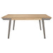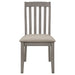 Place this modern farmhouse style dining set in a home for a more elegant look. Complete with a long table and four chairs, this dining set comes in a two-tone finish of a coastal grey and natural acacia wood finish. Each of the four chairs offer a curved slat style backrest and a padded seat, wrapped in a grey linen-like upholstery. The table adds a striking, contemporary vibe with its flared legs outward beveled edges. Invite the family to enjoy a casual meal and catch up with each other's lives.