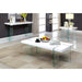 This sofa table pushes the boundaries of minimalistic design. A high gloss lacquer coated table top is held up by four tempered glass table legs. This is a truly one-of-a-kind set for the experimental individual or the modern inclined interior.