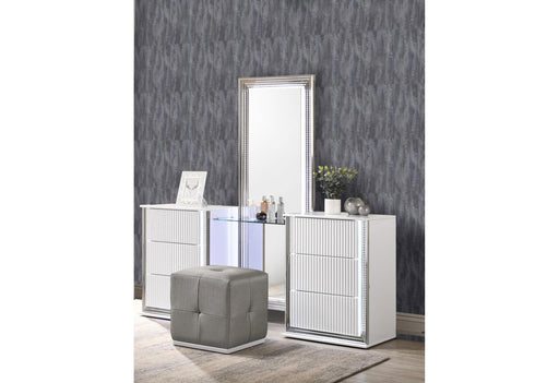 Covered in a high gloss white finish for an all-around sleek look, this contemporary vanity desk and matching mirror are perfect for dressing areas...